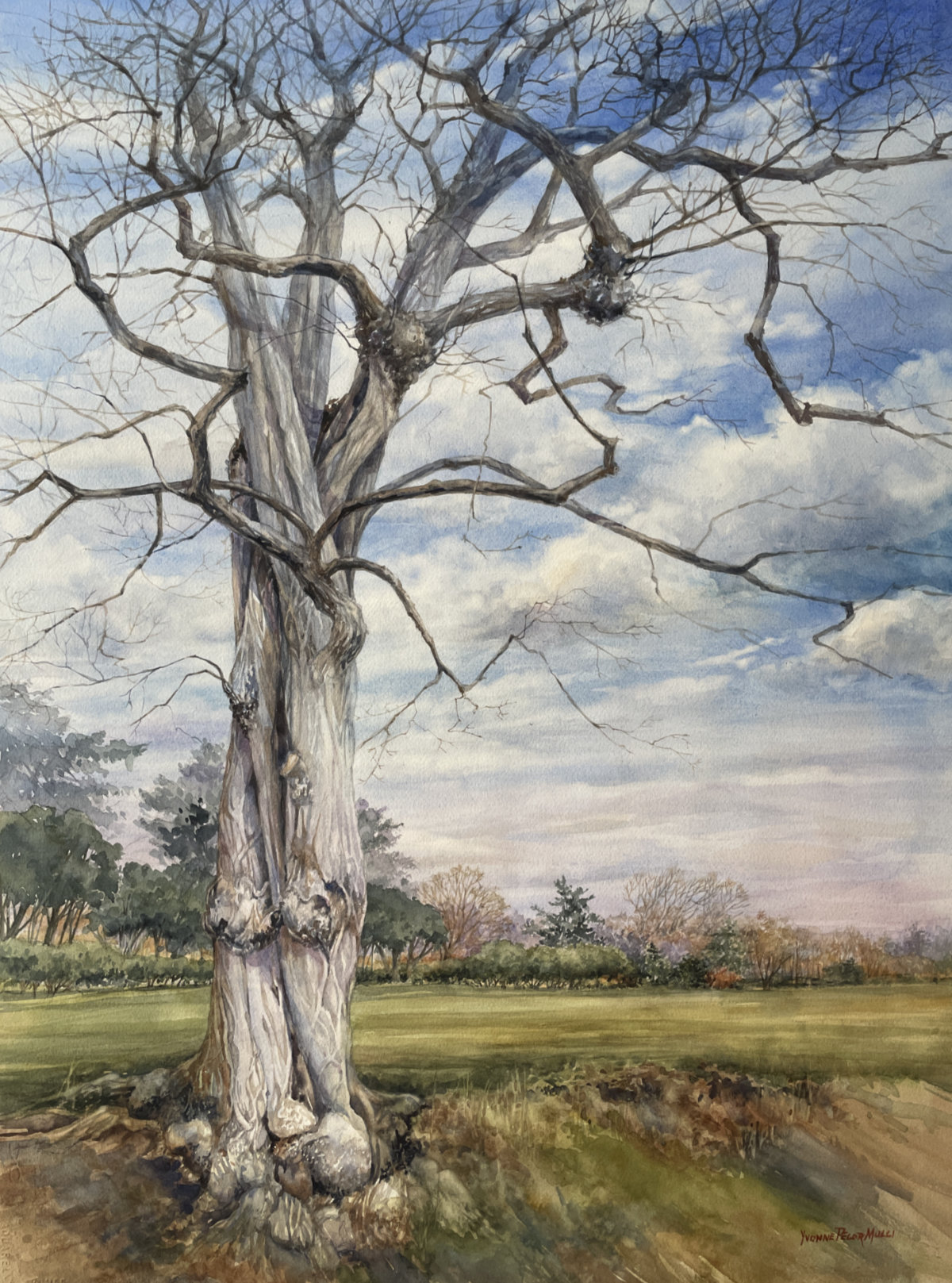“Twisted “is a watercolor portrait of a black locust tree. Loved how this tree appeared ancient and strong. I remember being mesmerized of the view from below. The sky was painted with washes of pale blues and violets to give a soft contrast to the heavily textured tree. Working in 20 x 30 size allowed me to dig into the detail with emphasis on the upper and outward movement of the tree. Feedback on this watercolor is always welcome.