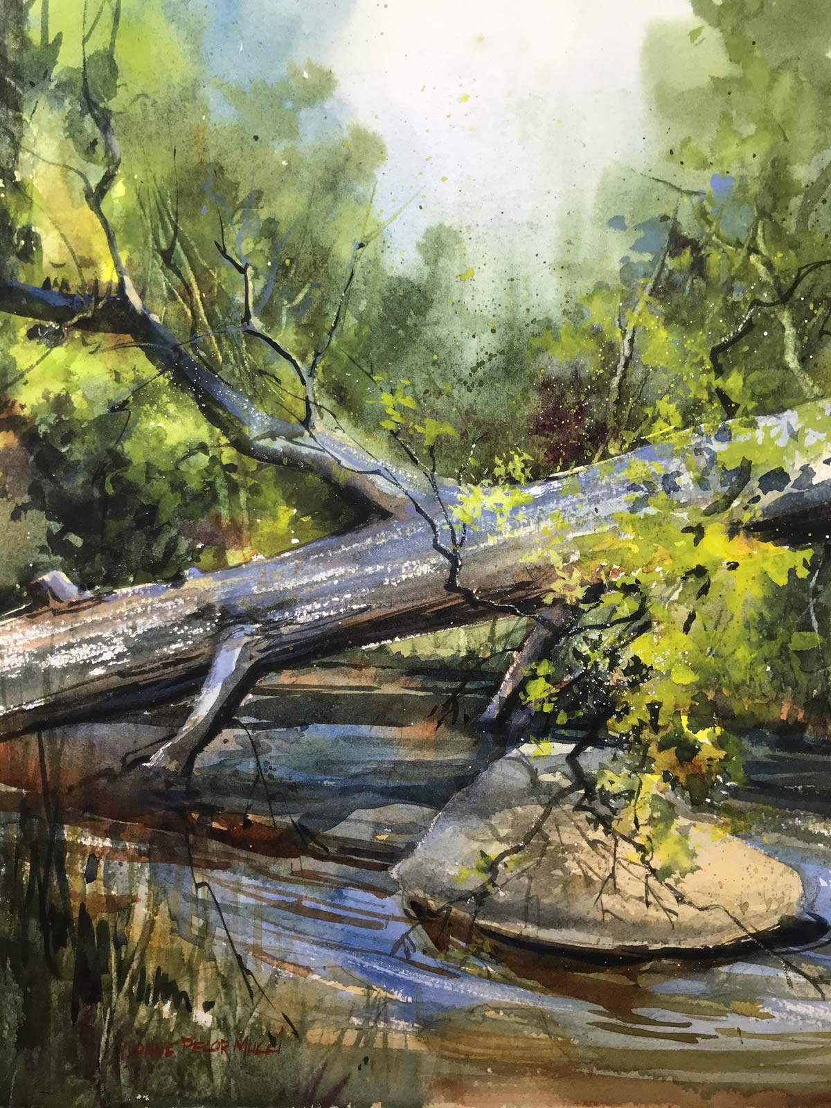 “Fallen” watercolor was a quick afternoon painting session at Ashbridge Preserve for Land Art Events. The title felt like an appropriate nod to the pandemic. I really tried to paint loosely, lots of heavily loaded pigments on my brush, letting the watercolor flow to give a sense of what it felt like to be standing near the Brandywine Creek with all the lush greenery around me. This painting is available through www.landartevents.com in Gallery 9, or you can contact me directly. Size is 11×14 in a 16×20 frame.
