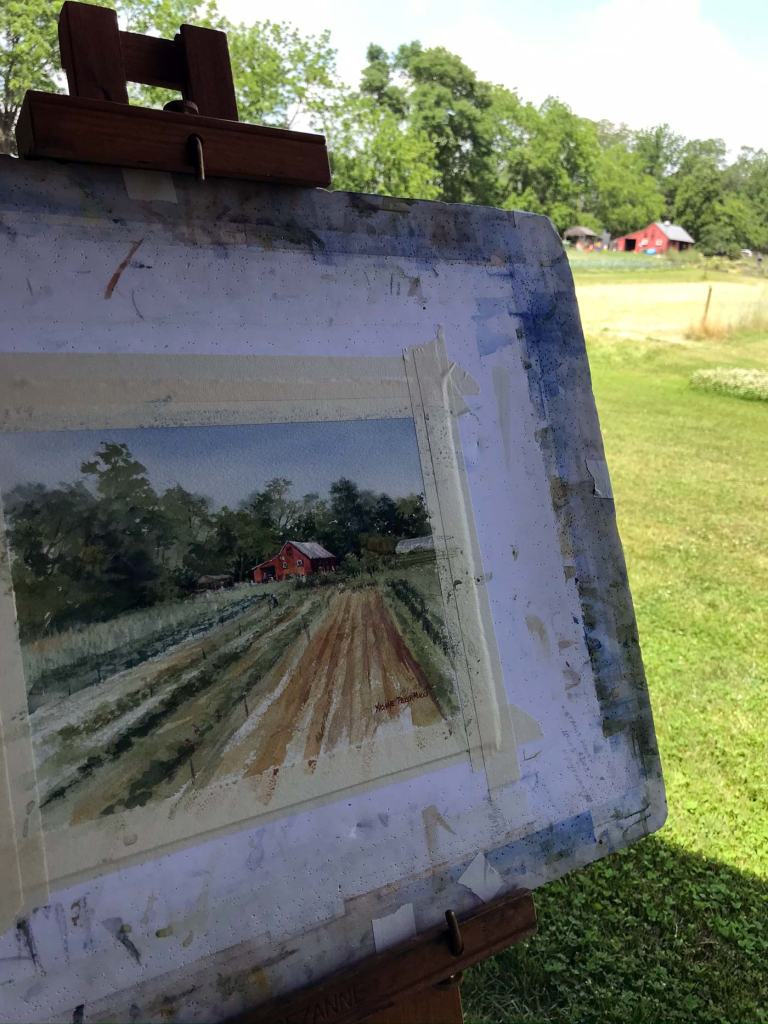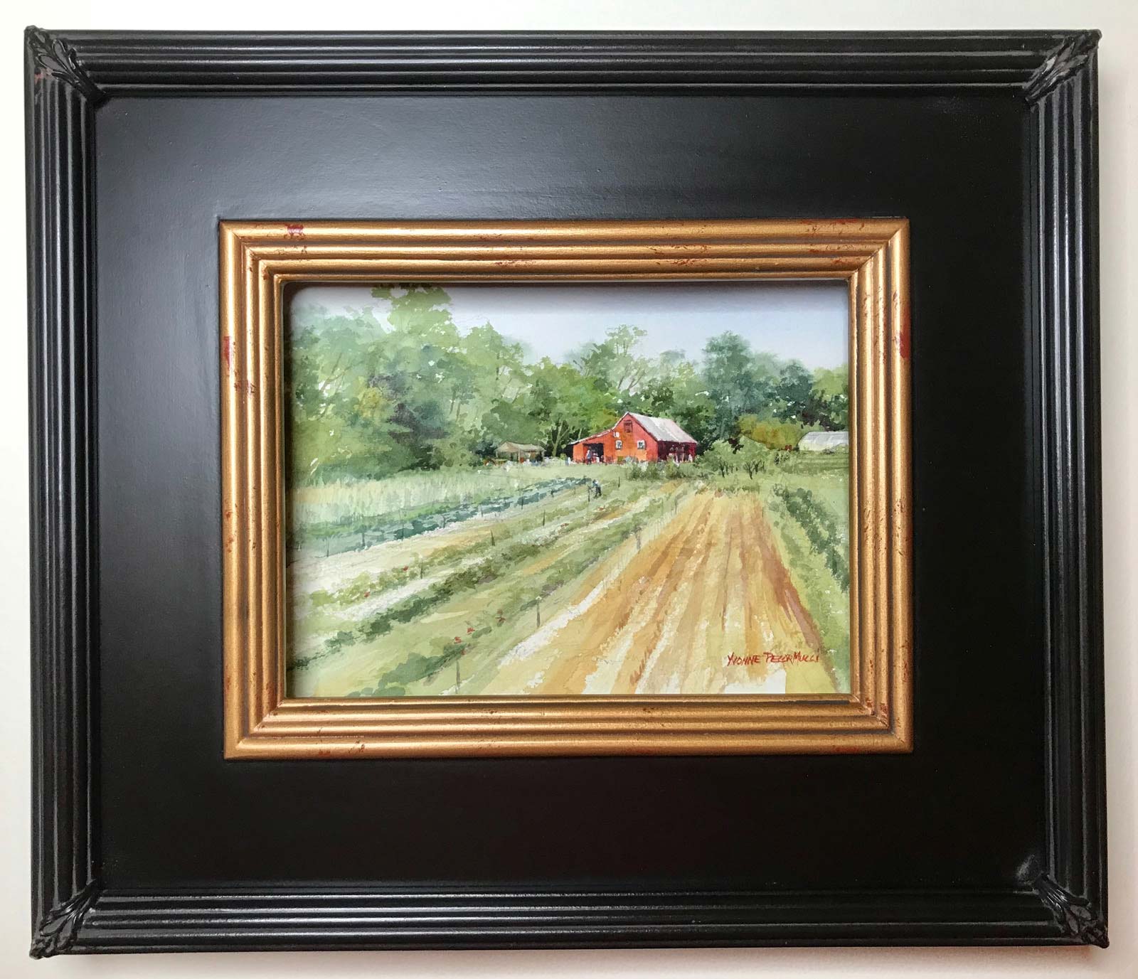 Personally, it has been an extremely difficult year, so getting outside to paint was good for my mind and soul. One activity that is safe during Covid. This lovely scene was painted en plein air at Rushton Woods Farm Preserve for Land Art Events, Farm to Table Palette to Palate event. I chose the title “Loving The Land” because those working at this CSA truly do love the land. Watercolor is mounted on hardboard and finished with cold wax, making the surface look similar to an oil, no glass needed. Photo below shows it framed in a 6×8 plein air frame.