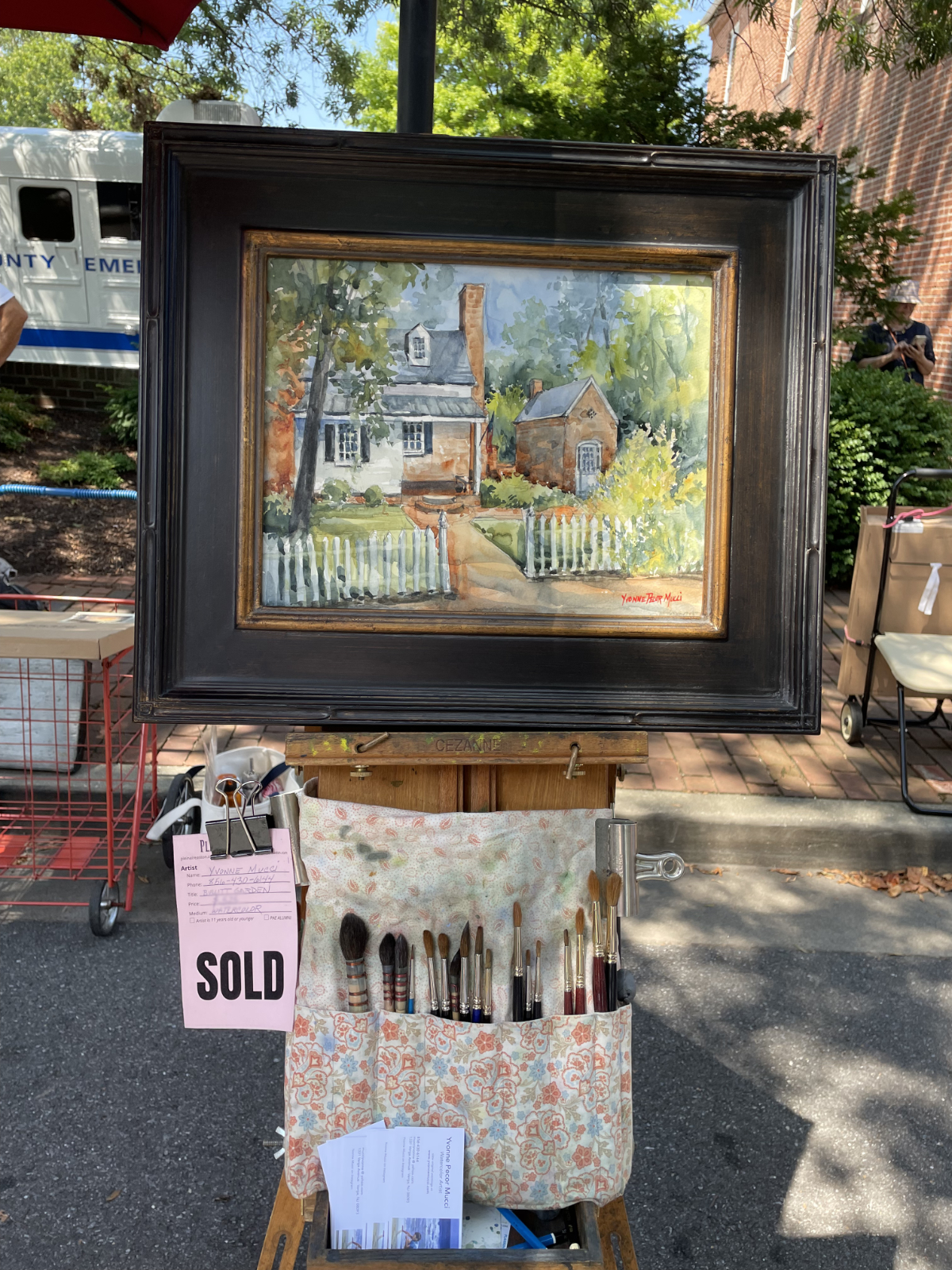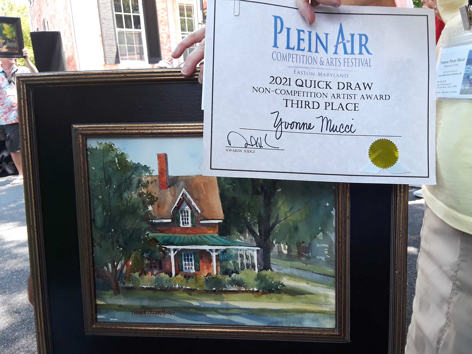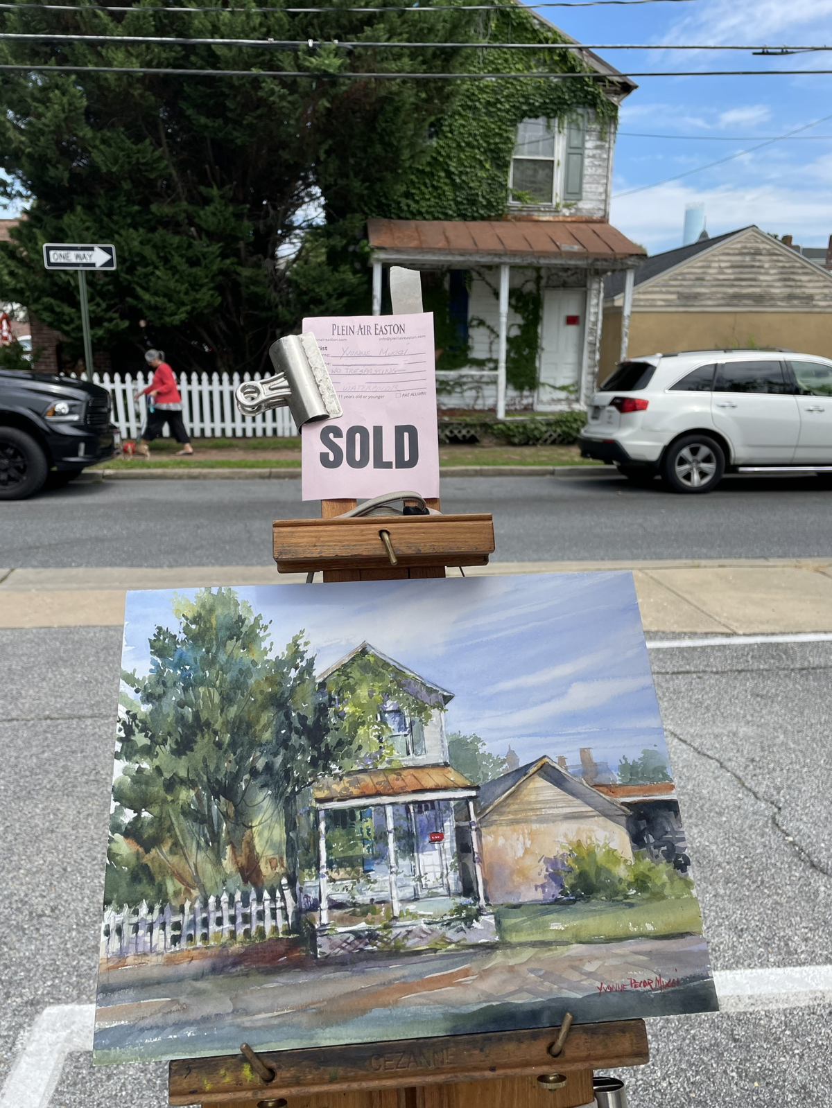 I have always wanted to participate in Easton Plein Air because the quality of artwork produced is so darn good. This summer fellow artist Annie Strack and I traveled to Easton, Maryland for the Quick Draw competition. It was so sweltering hot that day, but we found a shady street, set up our easels, and got to work. I loved this 19th century Victorian Gothic Brick Cottage with its steep gable roof and triangular louvered windows. Two hours later the effort was framed and displayed to be viewed and judged. Thank you to judge Daniel H. Weiss for choosing my watercolor. So exciting to hear your name called to receive the third place award! It was a pretty spectacular day filled with amazing artwork in the street and at the local art museum.
