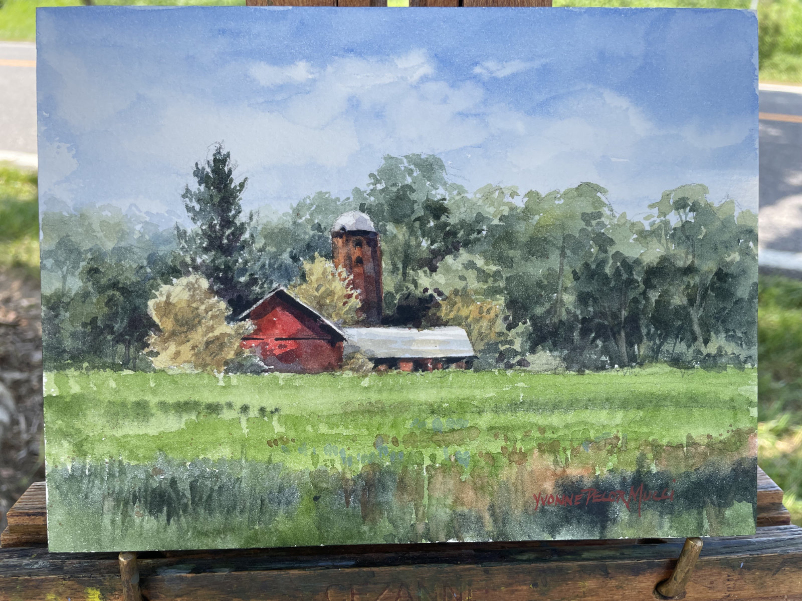 Artists, while driving, pass beautiful properties and farms thinking “oh, I’ve got to go back and paint that scene”. Along The Road was painted for Land Art Events. Happy Hollow Farm was so interesting with all those windows. You never see barns like that! Lots of locals waved, tooted their horns, and said hello while I was painting. This painting is available through Land Art Events. http://www.landartevents.com You can also contact me directly. The watercolor is 10.5 x 14, matted and framed 16 x 20.