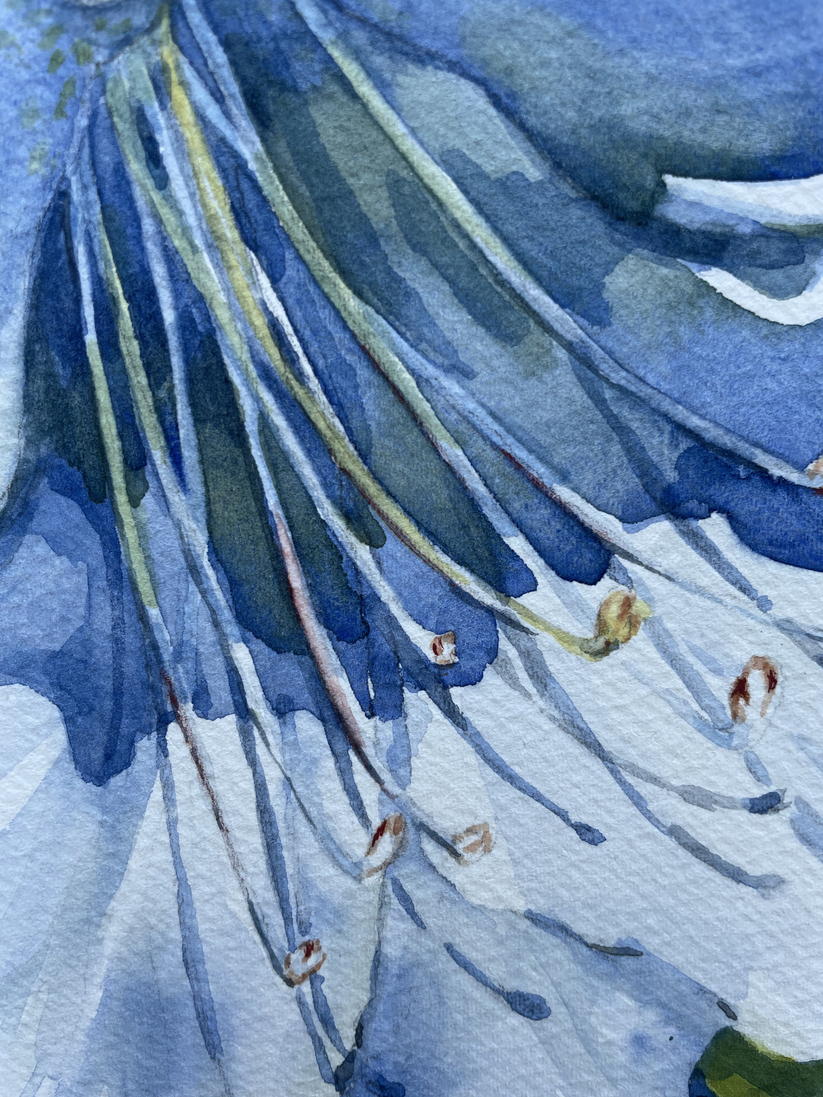 Morning Star Daylilies Farm has so many flower varieties, making it hard to choose which one. I spent the morning on their farm with Salem County Art League members. The sketch is a bit looser than the finished piece. Tough subject. So nice that they invited us out to paint their gorgeous daylilies! This watercolor is 8×10 mounted on hardboard and spray varnished, available unframed.