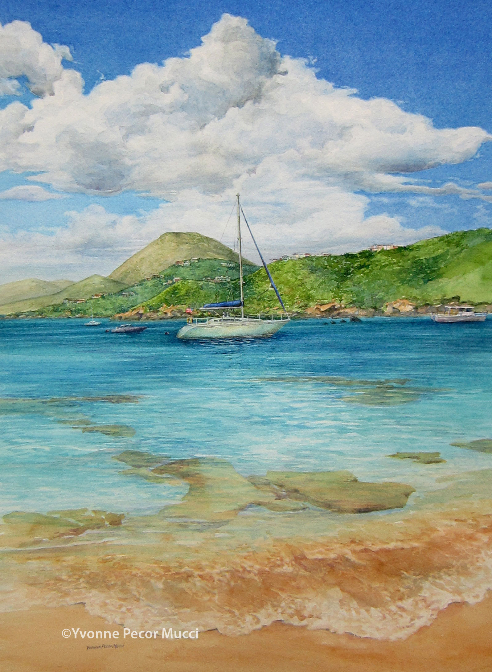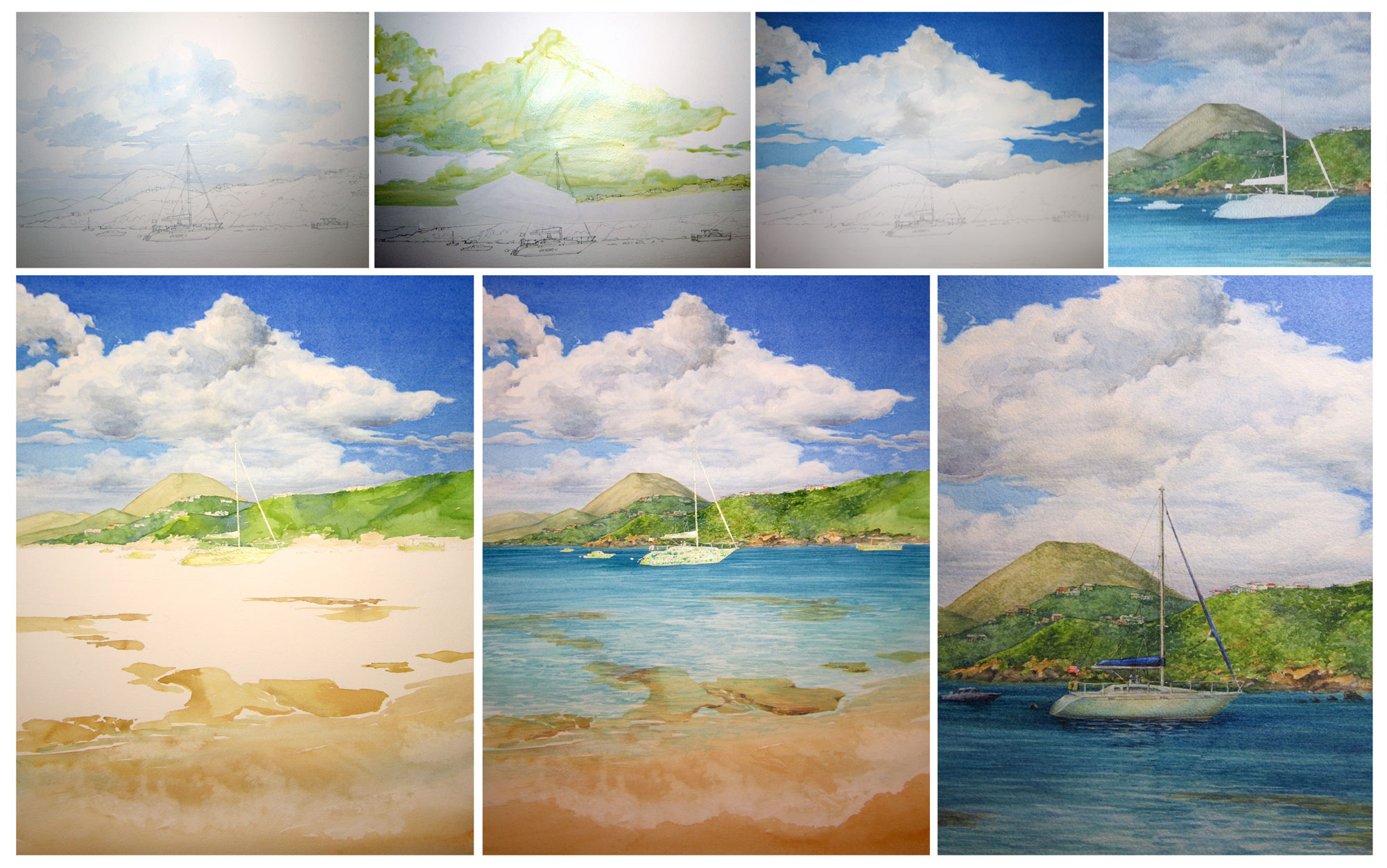 The painting composition has been changed from the original sketch. I wanted to include the dynamic clouds that build over St Thomas and the coral reef in the foreground. People have asked if the water is really that color. It is that color, depending on the time of day and the amount of sunlight flowing through the crystal clear water. It is a beautiful thing to observe in person.